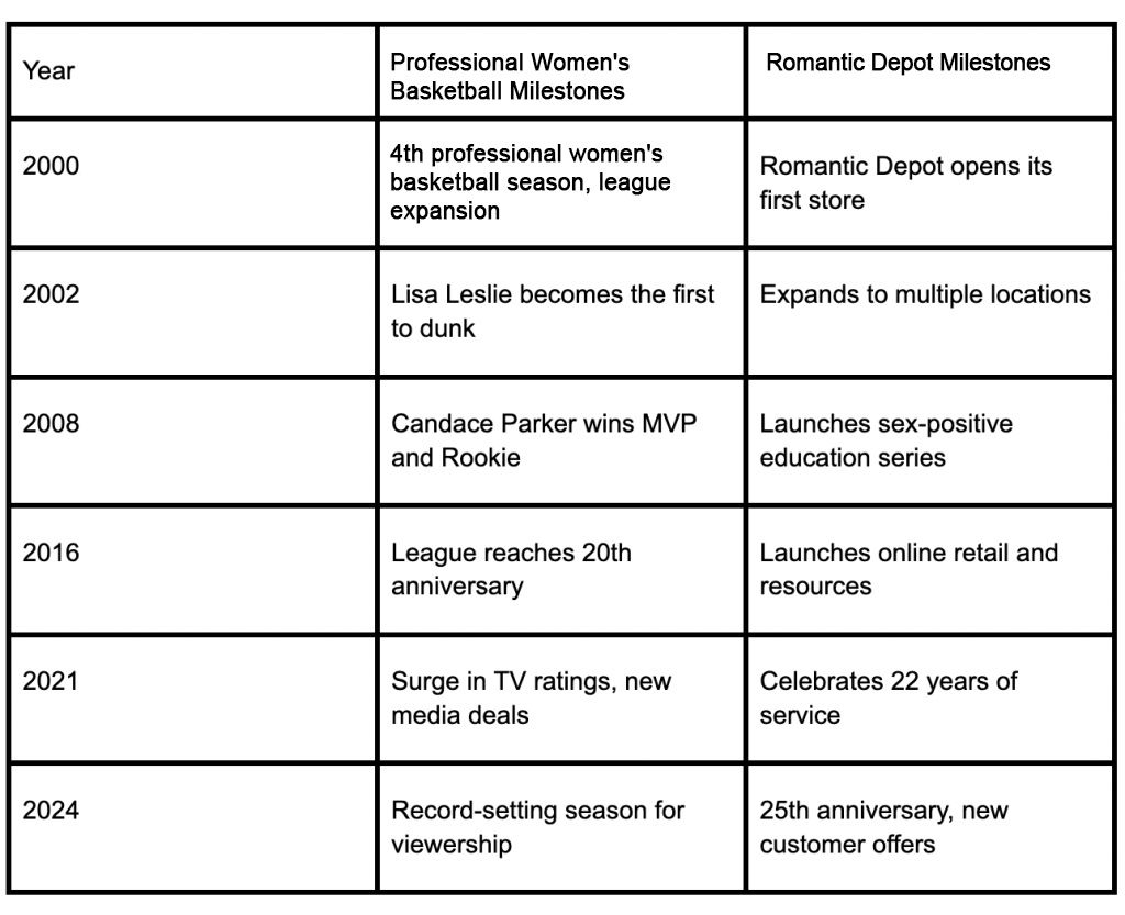 To put those changes in perspective, here’s how both professional women’s basketball and Romantic Depot have grown over the past quarter-century