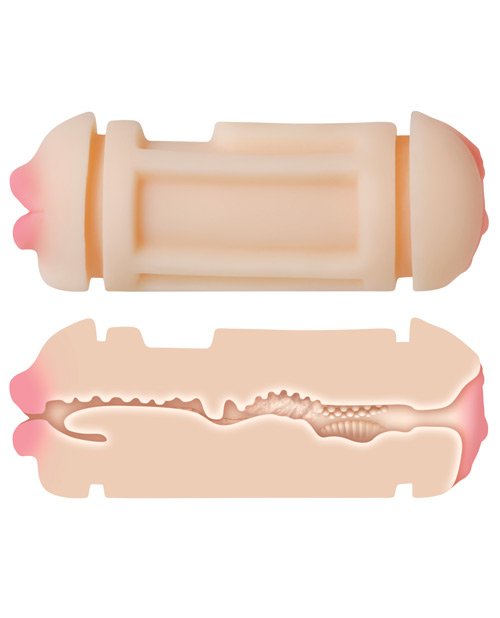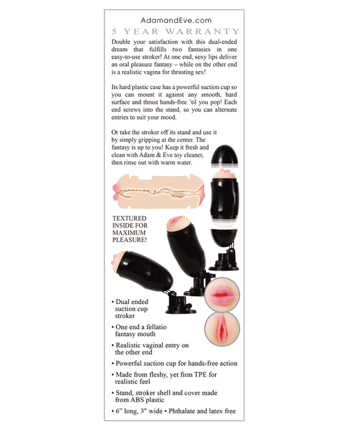 Adam and Eve Toys Adam’s Turbo Dual Stroker from Evolved Novelties. Double your satisfaction with this dual ended dream that fulfills two fantasies in one easy to use stroker! At one end, sexy lips deliver an oral pleasure fantasy while on the other end is a realistic vagina for thrusting sex! Its hard plastic case has a powerful suction cup so you can mount it against any smooth, hard surface and thrust hands free until you pop! Each end screws into the stand, so you can alternate entries to suit your mood. Dual ended suction cup stroker. One end a fellatio fantasy mouth. Realistic vagina entry on the other end. Powerful suction cup for hands free action. Material: Thermoplastic Elastomers TPE for realistic feel. Stand, stroker shell and cover made ABS plastic. Size 6 inches long by 3 inches wide. Phthalate free and latex free. 5 year warranty.