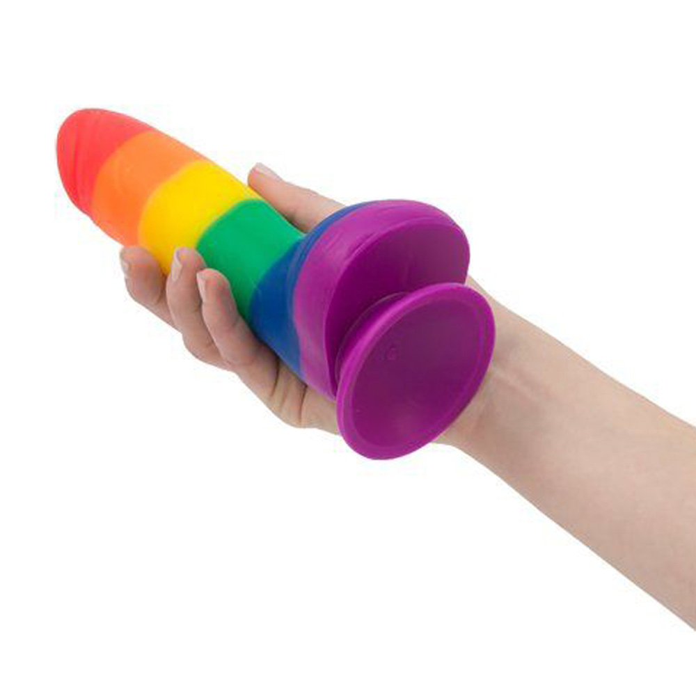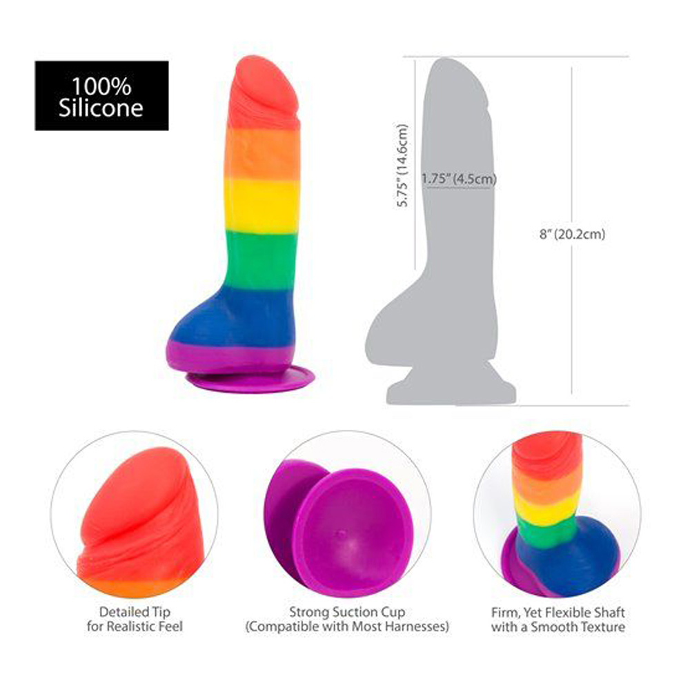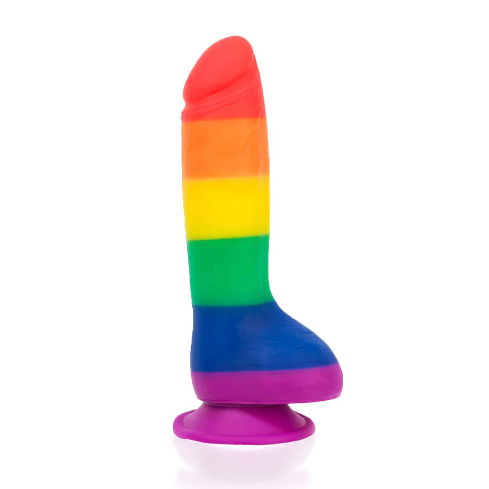 This colorful silicone rainbow dong with balls is decked out with a bright rainbow showing off those Pride colors! Justin is 8 inches long with a diameter of 1.75 inches. The firm rigid shaft and flexibility make it ideal for solo play, when you use the strong suction cup. The balls and suction cup can be used as a handle when you want to have a more hands on approach to your fun. It is designed so that it easily fits in a harness so that you can share it with your partner. Justin wears his colors with pride and offers a wild ride. Material Silicone.