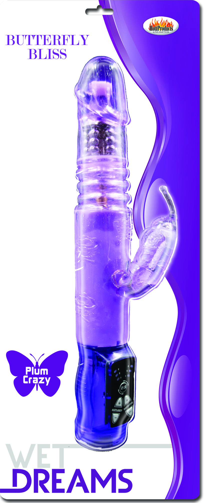 Wet Dreams Butterfly Bliss Mini Plum Crazy Purple Vibrator 3 speed thrusting shaft, 3 reversible rotating shaft. 3 speed clitoral stimulator. Independently controlled functions. Body safe, soft Thermoplastic Rubber TPR. Phthalate free. Requires 3 AAA batteries, not included. Length 9.5 inches.