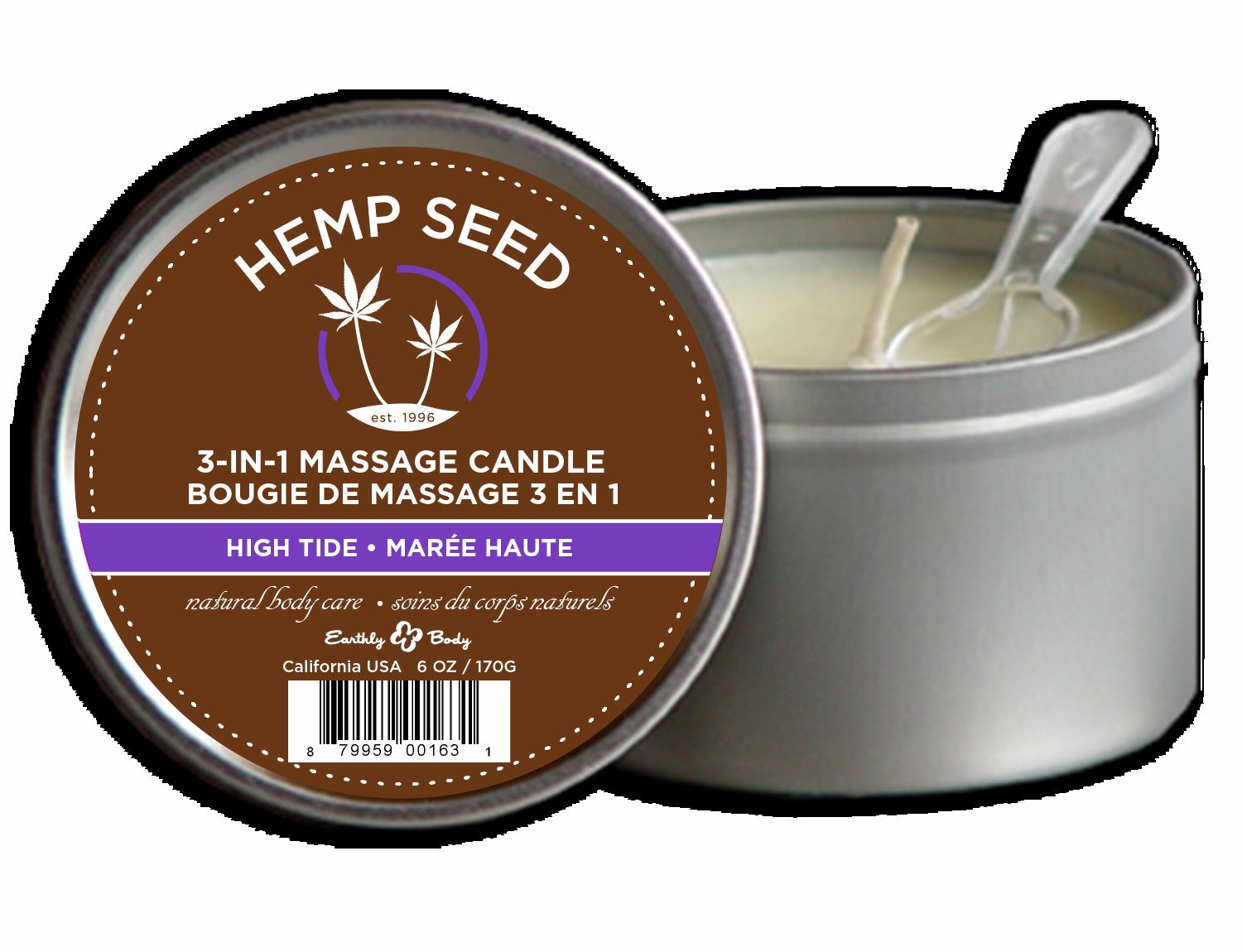 Earthly Body 3-in-1 Massage Oil Candle High Tide comes in a non-graphic round tin containers hand poured, fragrant natural soy-oil massage candle burns longer and cleaner. Candle melts into a warming, silky massage oil. Penetrates and moisturizes skin. Eight natural oils including hemp seed, Vitamin E, Jojoba, Avocado, and Apricot leave skin soft and smooth. Use right out of the shower or bath. Earthly Body’s most popular skincare products are our 3-in-1 Massage Candles. They’re unique, fun gifts and bonafide skin care rolled into one. These scented soy candles are all natural great-smelling, no-paraffin, no-petroleum, and clean-burning. What makes them different and fun is that they can be used for giving warm massages or can be used every day after a bath or shower as a body and skin moisturizer. Their massage candles are formulated with quality cosmetic grade ingredients. 100% vegan, non-toxic materials. All natural skin care products, hemp seed oil, lotions, hemp skin care products, soy scented candles. Never leave a burning candle unattended. Always store out of reach of small children. Suntouched Round Candle High Tide: Coconut, Lime Verbena Scent by Earthly Body of Chatsworth, California. Package dimension: Height 1.75 inches, Length 2.50 inches, Width 2.50 inches. Packaged weight 8 ounces. Coming soon new package brown with Hemp Seed name change. -2014 yellow label.