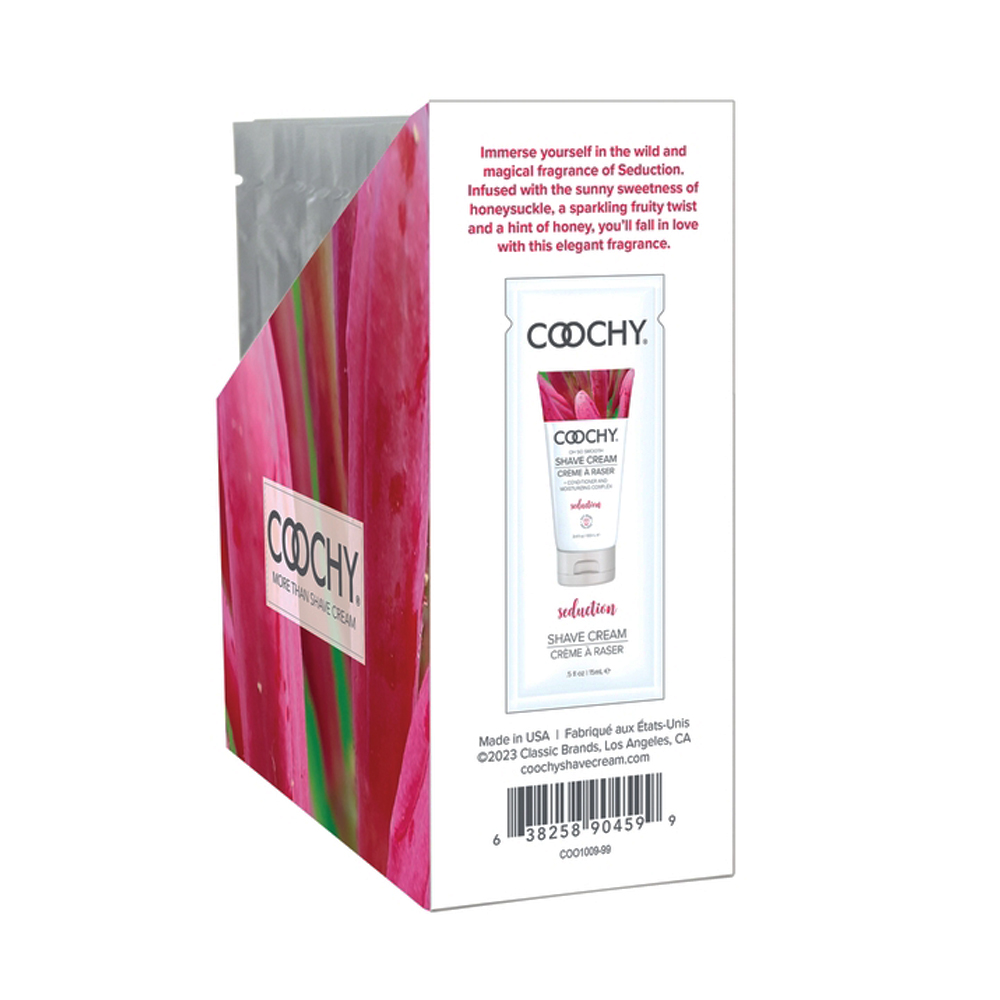 Immerse yourself in the wild and magical fragrance honeysuckle with the Coochy Shave Cream Seduction 15ml in Sample Size. Infused with the sunny sweetness of honeysuckle, a sparkling fruity twist and a hint of honey, you will fall in love with this elegant fragrance. Our signature shave cream stops red bumps from appearing on your bikini area, underarms, legs, and anywhere else you shave. Leaves skin oh so smooth and irresistible to touch! The Coochy Shave Cream is gentle enough for all areas of the body. Designed for both men and women use. Dermatologist tested. Ideal for sensitive skin. Doubles as a gentle, moisturizing hair conditioner. TSA friendly.