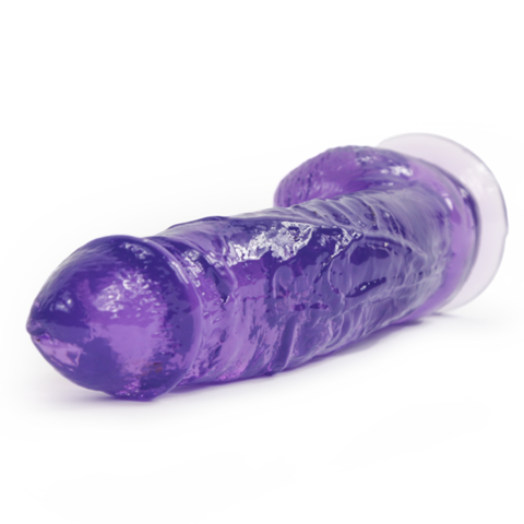 Climax Cox 9 inches Colossal Cock, Naughty Purple. Harness compatible suction cup base. Soft but firm PVC. Realistic tip with raised veins on shaft. Waterproof, non-vibrating realistic dildo from Topco Sales. Made in the USA. Width 2.25 inches, height 9 inches, depth 3 inches. Bulk weight 1 pound.
