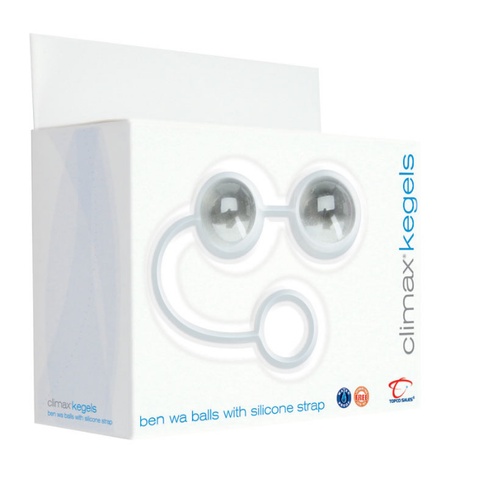 Climax Kegels Ben Wa Balls with Strap. Solid glass Ben Wa Balls with ultra hygienic silicone strap. Silicone strap makes them easy to insert and remove. Silicone can be boiled, frozen, microwaved or placed on the top rack of the dishwasher. Silicone’s soft texture becomes slick when lubricated. Silicone is durable, nonporous, hygienic and can last a lifetime. Waterproof, non-vibrating orgasm balls. Phthalate free, non-toxic materials silicone, glass. Climax delicate, inviting packaging plus fabulous, inventive toys equals a toe-curling climax every time. Sexy. Simple. Climax. Climax Kegels Ben Wa Balls with Strap from Topco Sales. 18