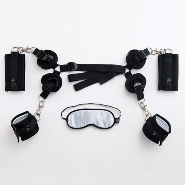Fifty Shades of Gray Official Collection Bed Restraints Kit. Transform your bed into a bondage playground and enjoy the fettered throes of lust in soft satin. Ideal for beginners, this bedroom bondage set can be used to create a full body restraint that’s quick and easy to secure. 4 soft cuff restraints with velcro fastening make easy work of full body bondage, allowing you to focus entirely on your pleasure. Connect the cuffs together as handcuffs or ankle restraints using the incorporated swivel clips, or append them to the included bed straps for a firmer restraint that securely binds you to your bed. Simply place the bed straps beneath your mattress and adjust the length and widths to size, creating a platform for wrist and ankle restraint without the need for a bed frame or any specialist equipment. Adjustable to fit single, double, kingsize and super-kingsize beds and easy to fold down to a portable size for storage and easy travel, this set is ideal for couples to whom discretion is key. The strap system measures 49 inches in length with two widths for the cuffs to attach, each measuring 98 inches across. 4 straps protrude from beneath your mattress, exposing 4 O-rings to which the cuffs connect, forming your bondage restraint. Supplied with a Fifty Shades of Grey storage bag, this bed restraint kit is the ideal erotic gift. 15