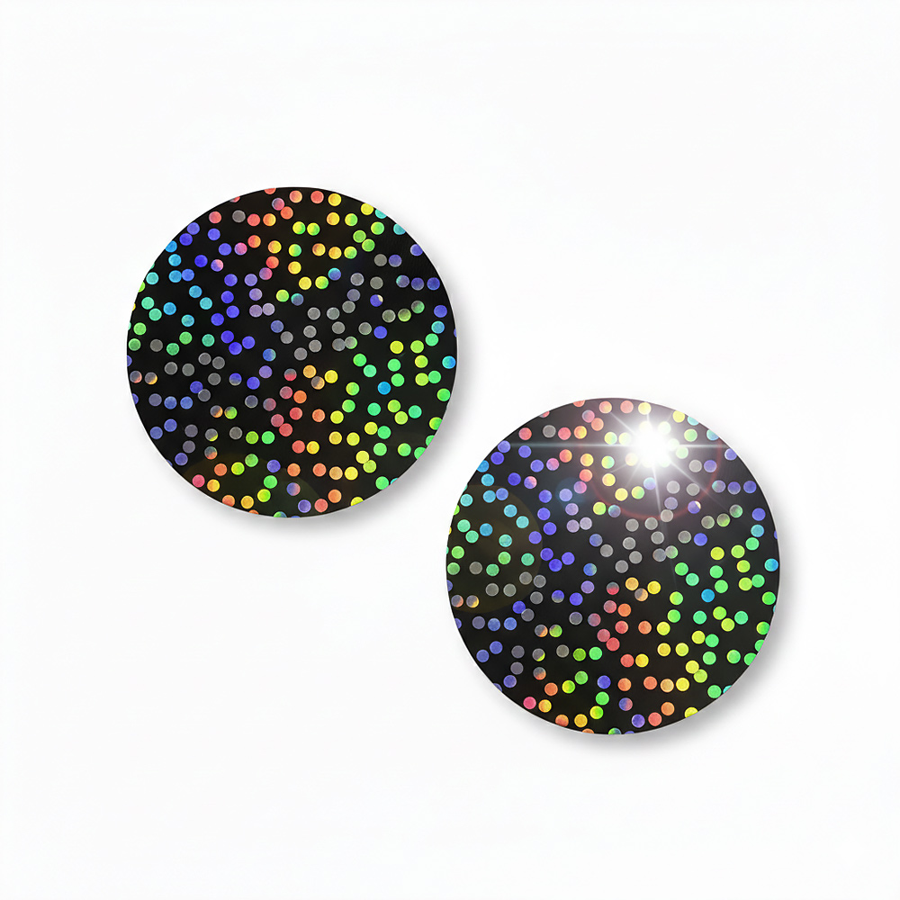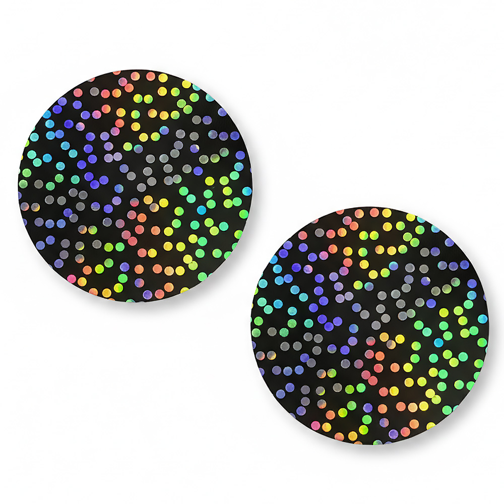Elevate your style and vibe into a sexy new dimension! These shimmering Holographic Circle Nipple Pasties Nipple Pasties are comfortable, long-lasting nipple covers, designed to stay in place and adapt to your body’s shape. Peel-and-stick design provides a hint of seduction, and excellent nipple coverage under regular clothing, sheer clothing, or nothing at all! The interior adhesive is made from latex-free and waterproof material.