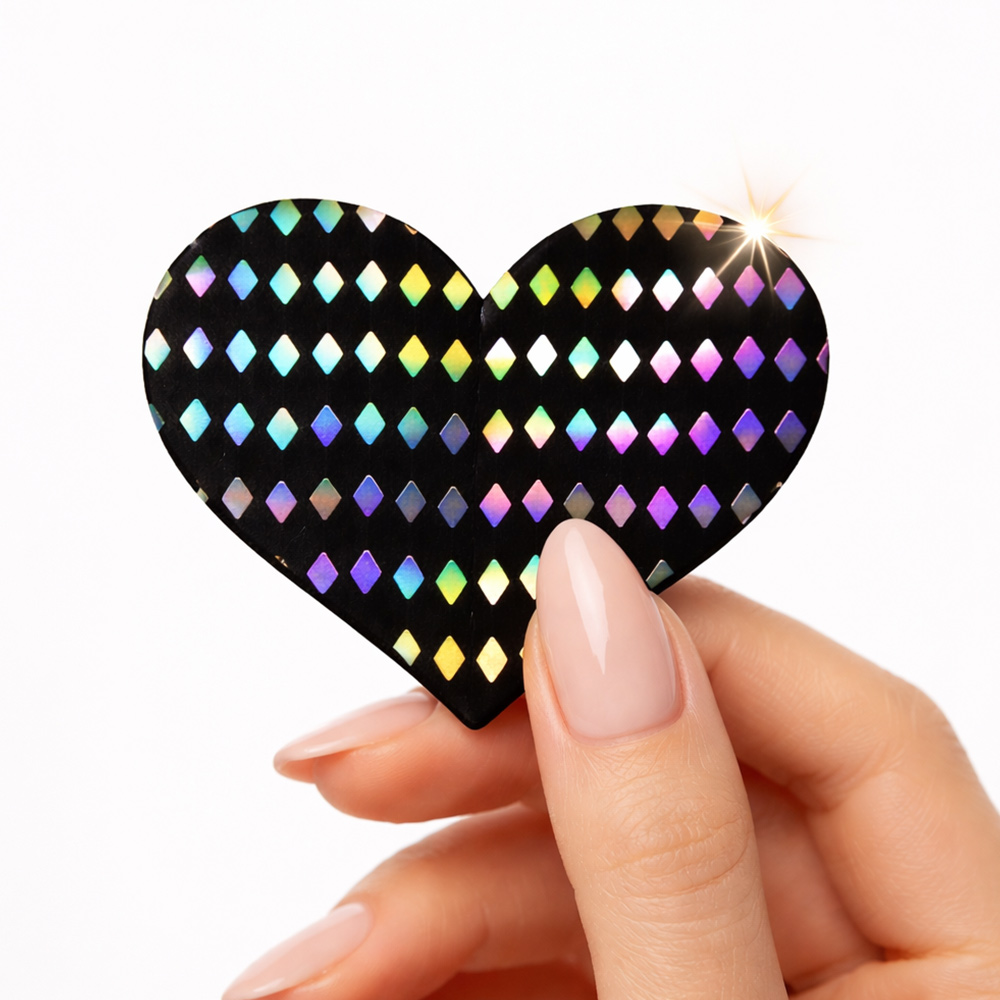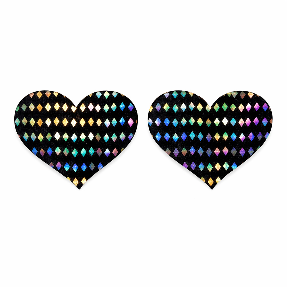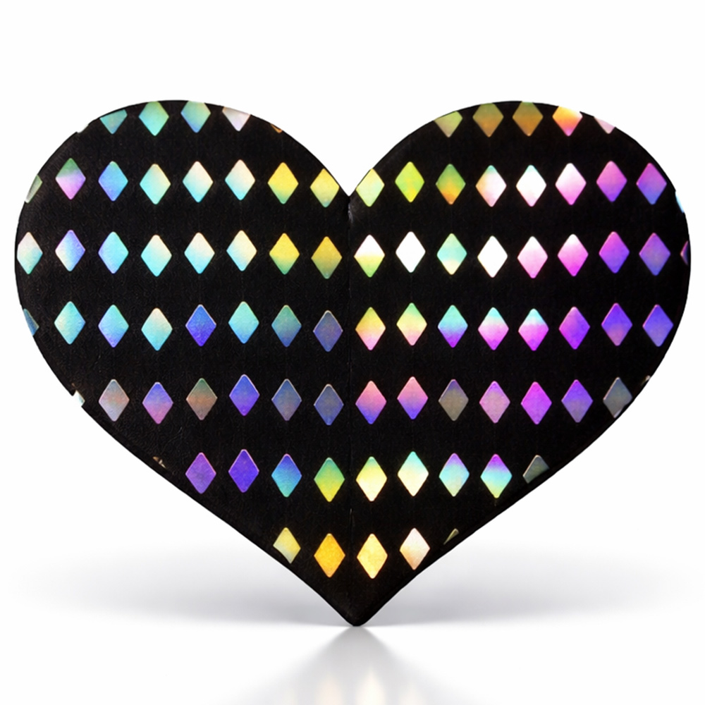 Elevate your style and vibe into another dimension with this sweet set of Heart-Shaped Holographic Diamond Pattern Nipple Pasties! These comfortable, long-lasting nipple covers are designed to stay in place and adapt to your body’s shape. Peel-and-stick design provides a hint of seduction, and excellent nipple coverage under regular clothing, sheer clothing, or nothing at all! The interior adhesive is made from latex-free and waterproof material.