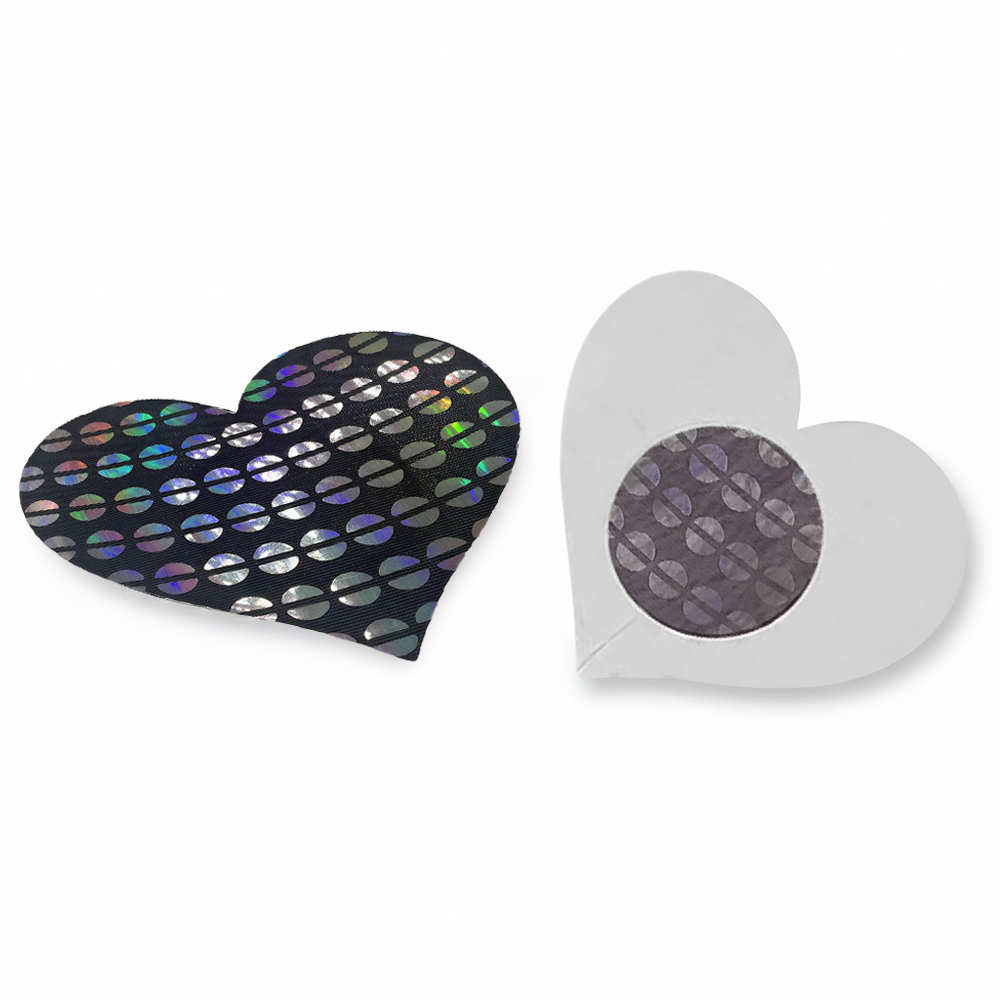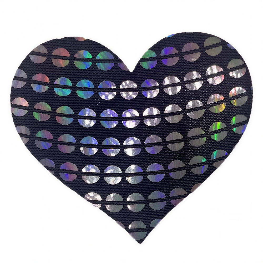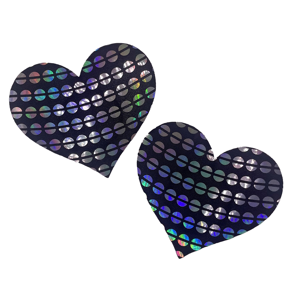 Elevate your style and vibe into a sexy new dimension with this sweet set of Holographic Sequin Pattern Heart-Shaped Nipple Pasties! These comfortable, long-lasting nipple covers are designed to stay in place and adapt to your body’s shape. Peel-and-stick design provides a hint of seduction, and excellent nipple coverage under regular clothing, sheer clothing, or nothing at all! The interior adhesive is made from latex-free and waterproof material.