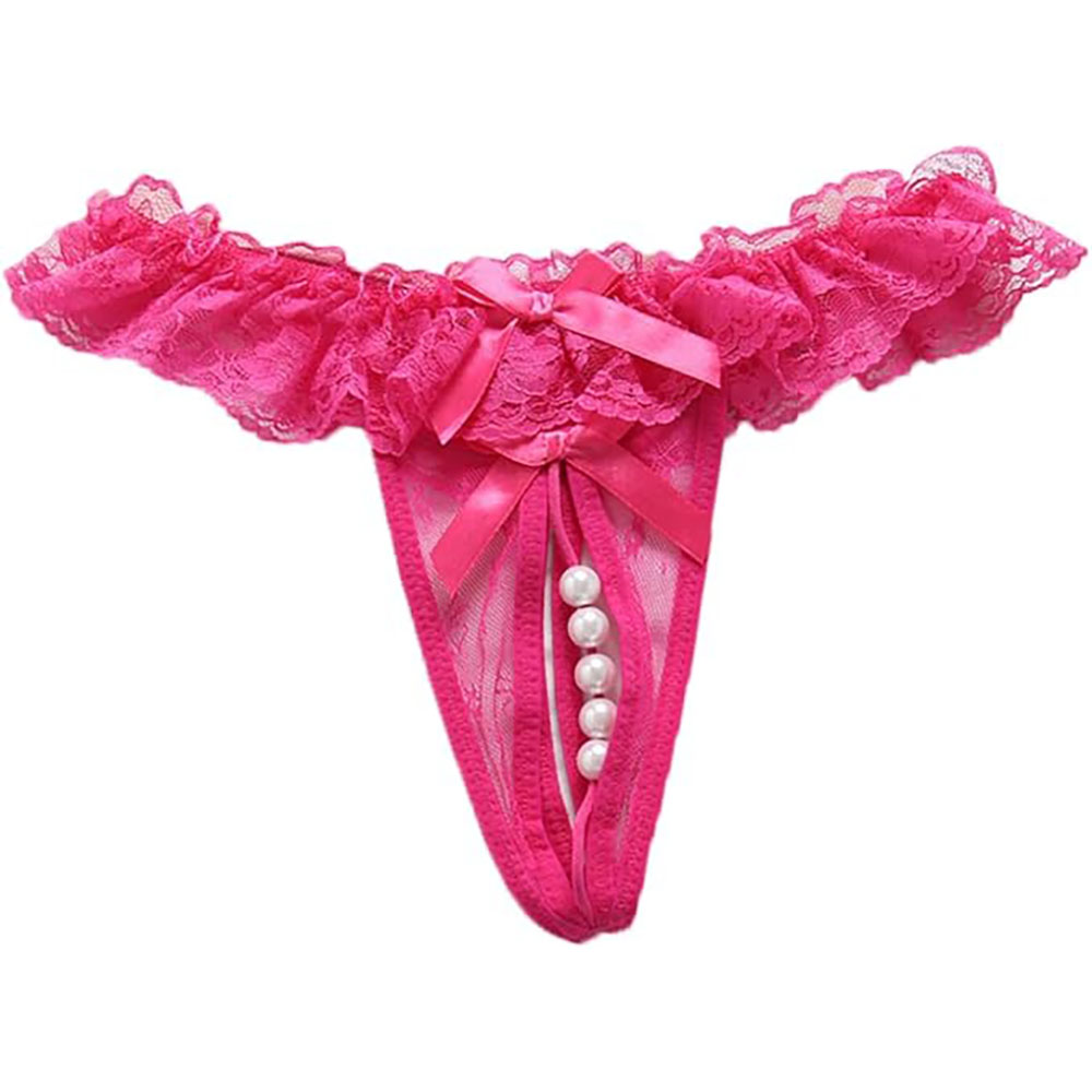 Hot Pink Frilly Lace Pearl G-String Thong Panties with Satin Bow – OS