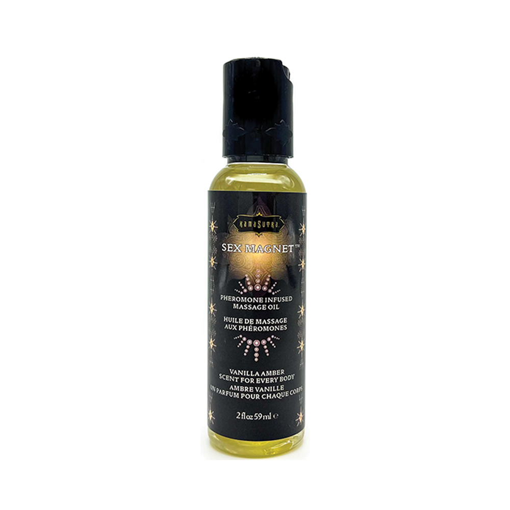 The Sex Magnet Pheromone Vanilla Amber Massage Oil in 2 fluid ounces from Kama Sutra Company is a pheromone massage oil for every body. This pheromone massage oil adjusts to your body’s chemistry to create a one of a kind scent that is unique to you. The rich, emollient formula makes it a pleasure to give or receive a sensuous, full body massage. Features: creates a unique fragrance on every body. Vanilla Amber scent is flattering on any gender. Ultra moisturizing and silky smooth. Long lasting for the perfect full body massage. Transportation Security Administration TSA approved for travel. Pack and go! Made in the USA with quality ingredients. Size 2 fluid ounces. What are pheromones? Invisible chemicals emitted by humans that play an essential role in relieving stress, improving mood, stimulating desire and attraction. How to use: massage onto the body with slow, even strokes. Then get ready to get noticed.