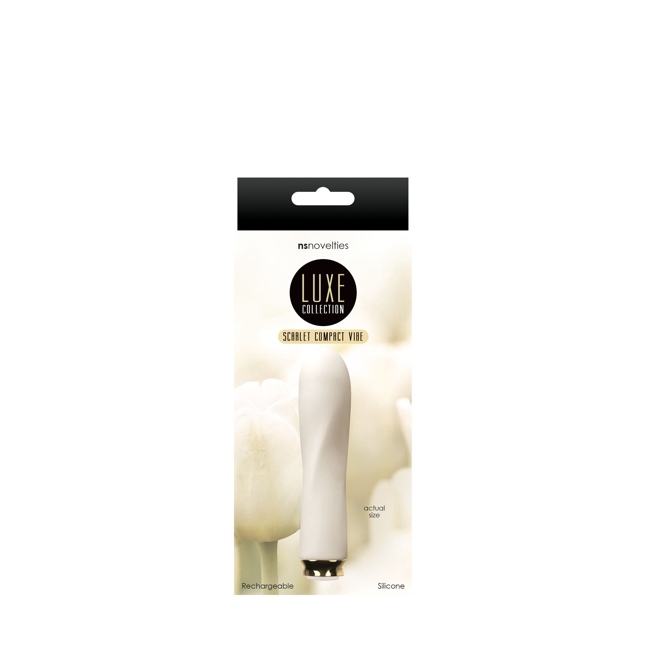 Luxe Vibe Scarlet Ivory bullet vibrator. Luxe Rechargeable Compact Vibes redefine luxury. Designed for performance as well as aesthetics, each beautiful Compact Vibe is coated in silky smooth silicone with onyx and rose gold accents. All 3 designs are available in creamy ivory and vibrant pink. Each sold separately. Featuring 7 robust functions, these stunningly powerful vibes are waterproof, body safe and virtually silent. A universal USB charger is included for convenience. Model Number: NSN-0207-21. UPC: 657447095122.