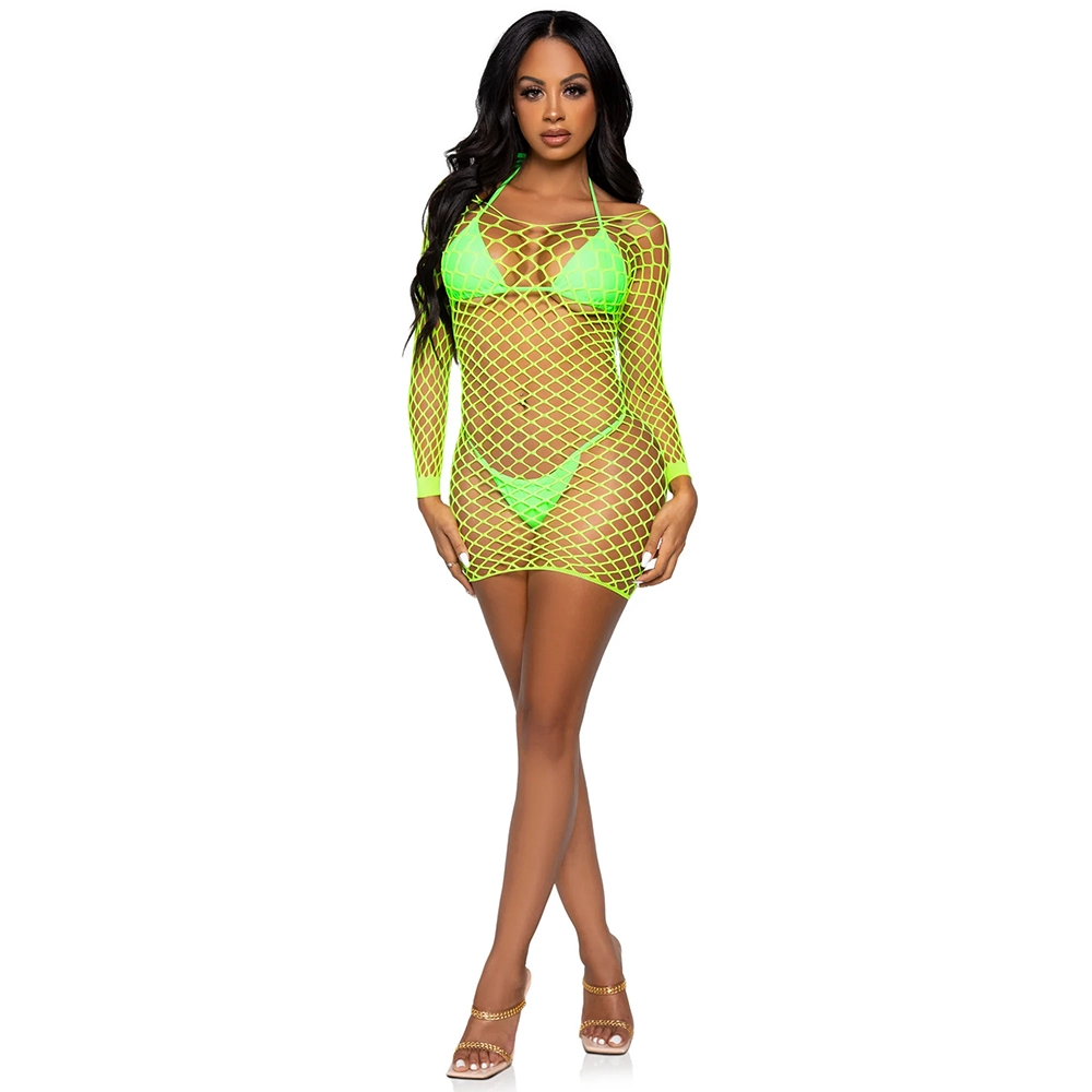 Neon Yellow Fishnet Mini Dress with Long Sleeves – OS