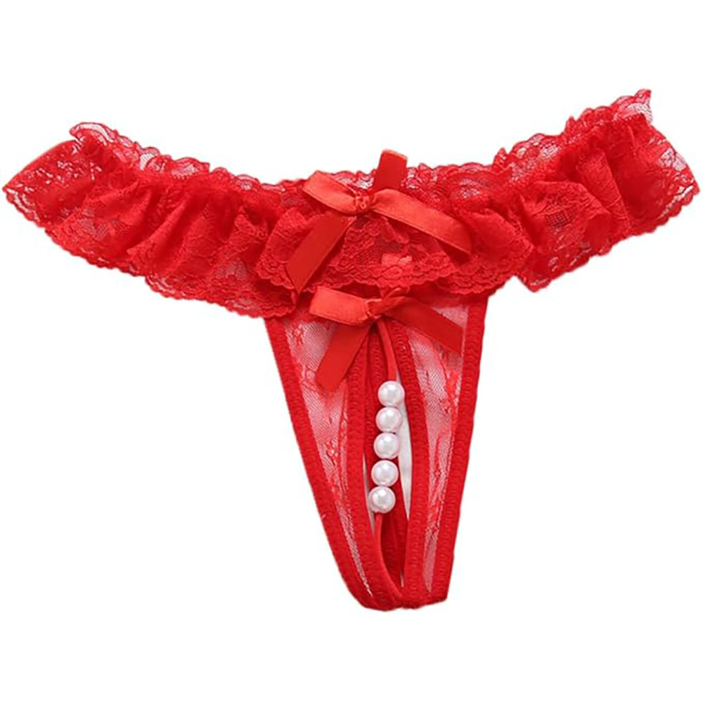 Red Frilly Lace Pearl G-String Thong Panties with Satin Bow – OS