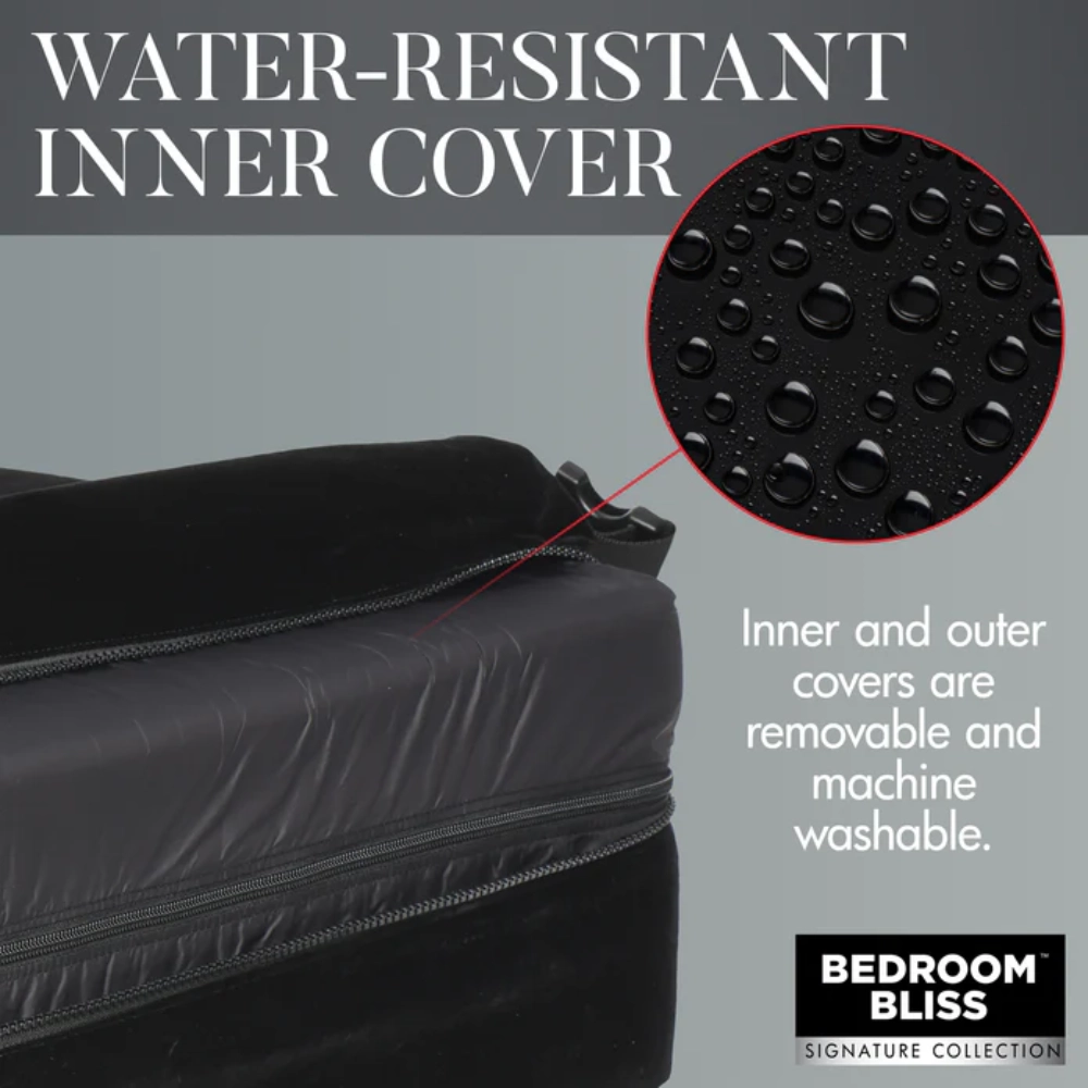 Find the perfect position with a little elevation from this BDSM Bondage Elite Wedge Position Master Sex Pillow and keep your partner there with the built-in clips for wrist or ankle restraints! This lightweight, high-density foam wedge is covered in a velvety soft outer layer and a water-resistant inner layer. It’s firm enough to lift you up and has enough softness to keep it sexy. Use it under your shoulders, chest, head, hips or knees to change the way you play! Both inner and outer pillow covers are machine washable, too! This kinky set includes 2 wrist cuffs, 2 ankle cuffs, 4 connectors with D-rings and 2 restraint connectors. There are also built-in clips for restraints or other accessories. The soft outer layer keeps it sexy and sensual as your skin brushes against the fabric while the water-resistant, inner layer keeps your foam pillow moisture free! This velvet, black wedge goes great with any dark or neutral color decor, can be placed on your bed behind other pillows and used as support when you’re sitting up, and is one of the simple yet essential pieces of your sexy bedroom collection! Use the pillow under your hips to tilt your pelvis and get greater access to hitting your G-spot or P-spot. Use it under your head for comfort and to lift the neck. Pad your knees as you pound your partner in Doggy style pose! Get on your side and use it between your shins or thighs to easily part your legs as your partner slips in behind you! At any time you can add cuffs or kinky bondage accessories to make it more interesting! Get fun and creative as you enjoy upleveling your love game! Measurements: Length: 13.5″. Width: 24″. Height: 6.5″. Cuffs adjust up to 14.5″ in circumference. Materials: Velvet (polyester), PU foam, nylon, resin (zipper). Color: Black. Note: Machine wash on cold for best results so the material does not melt, singe or overheat. Consider air-drying if your dryer runs hot. Key Features: High Density Foam: This foam keeps its shape and supports your body weight without letting you sink through the pillow. Ergonomic Design: Designed to support countless positions so you can get the most out of your sensual play! Machine Washable Covers: The outer cover is soft against the skin and the inner cover is water-resistant so the foam stays mildew and moisture-free. Easily wash your pillows after play by machine washing them after each use Bondage Included: Set includes 2 cuffs and connectors with D-rings and 2 restraint connectors so you can cuff your partner’s ankles or wrists to the pillow.