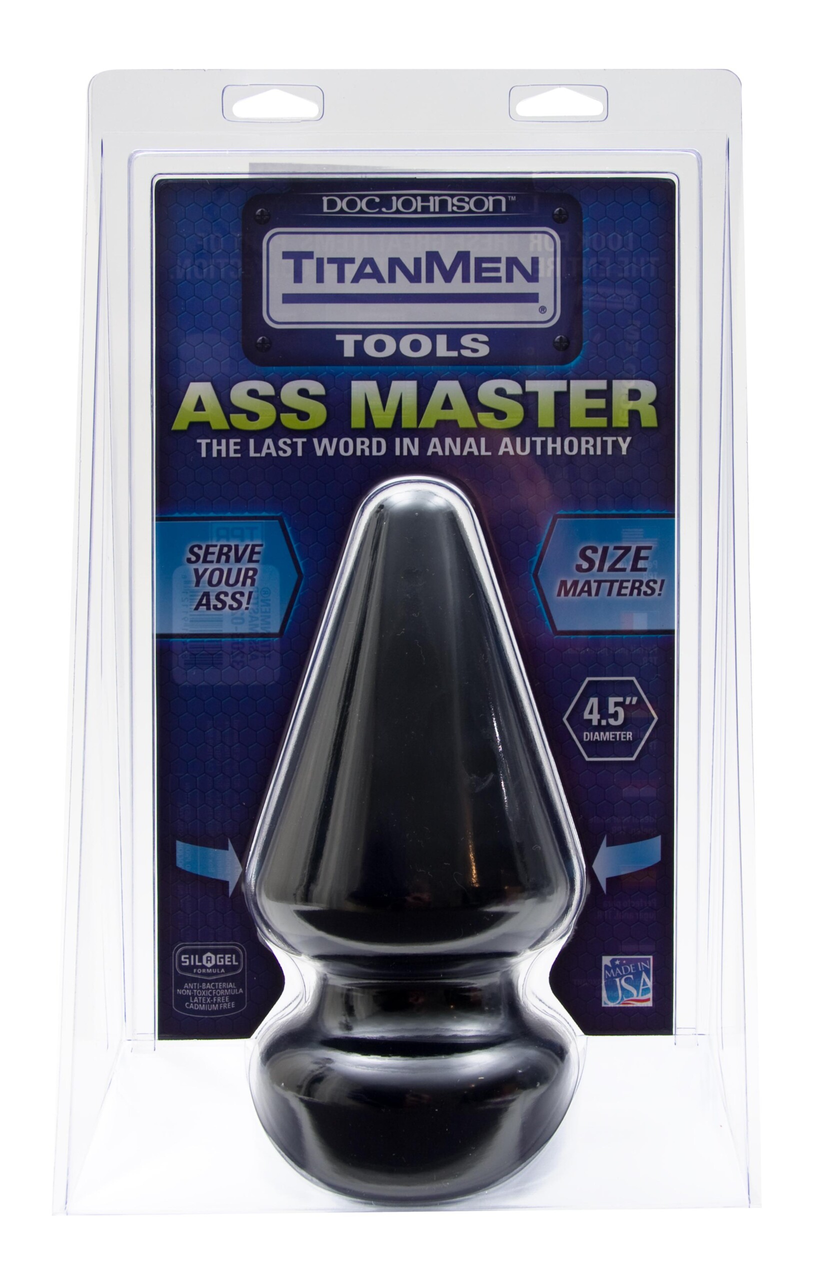 Titanmen Tools and Doc Johnson Novelties newest sex toys. Titanmen Ass Master Black Butt Plug 4.5 inches. Black butt plug for intense, advanced anal play. Titanmen Ass Servant is for the capable pig. While the Titanmen Master Butt Plug is for the experienced ass-master. Utilizing a revolutionary new material, these non slip toys have smooth entry points for pure anal enjoyment. These tools are safe to use and easy to keep clean. Dishwasher safe on the top shelf no heat setting. Butt Plug features: anti bacterial, non-toxic formula, latex-free, cadmium free. The Titanmen Master Black Butt Plug dimensions: 9.5 inches long, 4.5 wide plus an impressive 14.5 inches around at widest point. Please note this item is almost the largest butt plug sold by Doc Johnson, the largest is the Challenge Red Boy series. Not for the beginner of anal sex or prostate massage. Use care with the use. Also lube is recommended. If you should use a desensitizing lube watch for damage because some of these lubricants with Benzocaine or Lidocaine work too well and injury is possible. Always clean before and after use plus between partners. A water based lubricant is recommended. Always clean before and after use. extra large butt plugs, giant butt plugs, huge butt plugs, non-vibrating anal sex toy, non-vibrating butt plug. Doc Johnson Novelties Novelties The Great American Toy Company. Made in the USA.