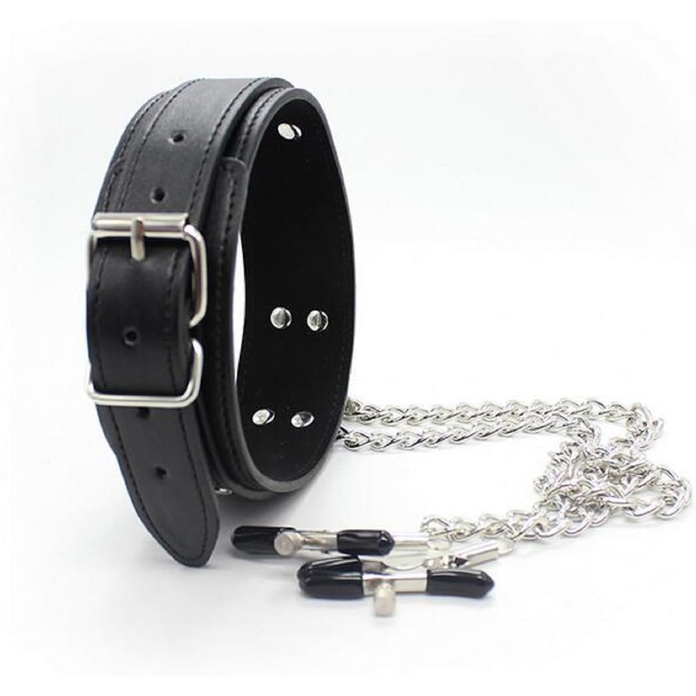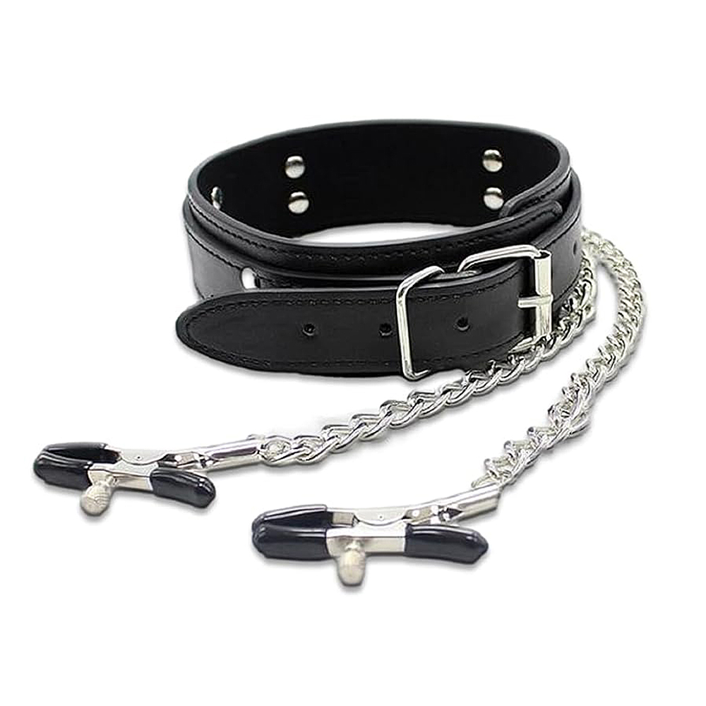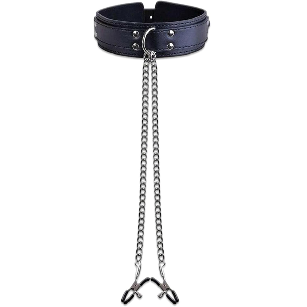 Elite BDSM Black Bondage Collar with Nipple Clamps
