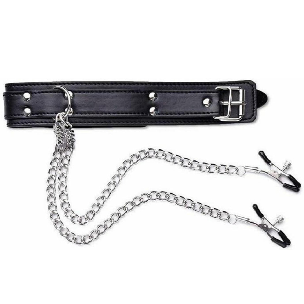 The sleek design of the Elite BDSM Black Bondage Collar with Nipple Clamps fits snugly around the neck, adding sophistication to BDSM play. The adjustable nipple clamps are attached by chain to the collar, as an eye-catching accessory. The alligator style clamps feature a screw, allowing one to customize the pressure for maximum pleasure. Designed with soft rubber tips, these nipple clamps provide a comfortable experience while delivering the perfect amount of pinch and pleasure. The combination of a bdsm choker and nipple clamps with chain necklace heightens arousal and deepens your connection with your partner. Perfect for exploring new fantasies and adding excitement to your sex toys nipple play collection. Ideal for both beginners and experienced users looking to enhance their bdsm play.