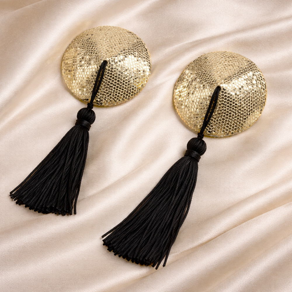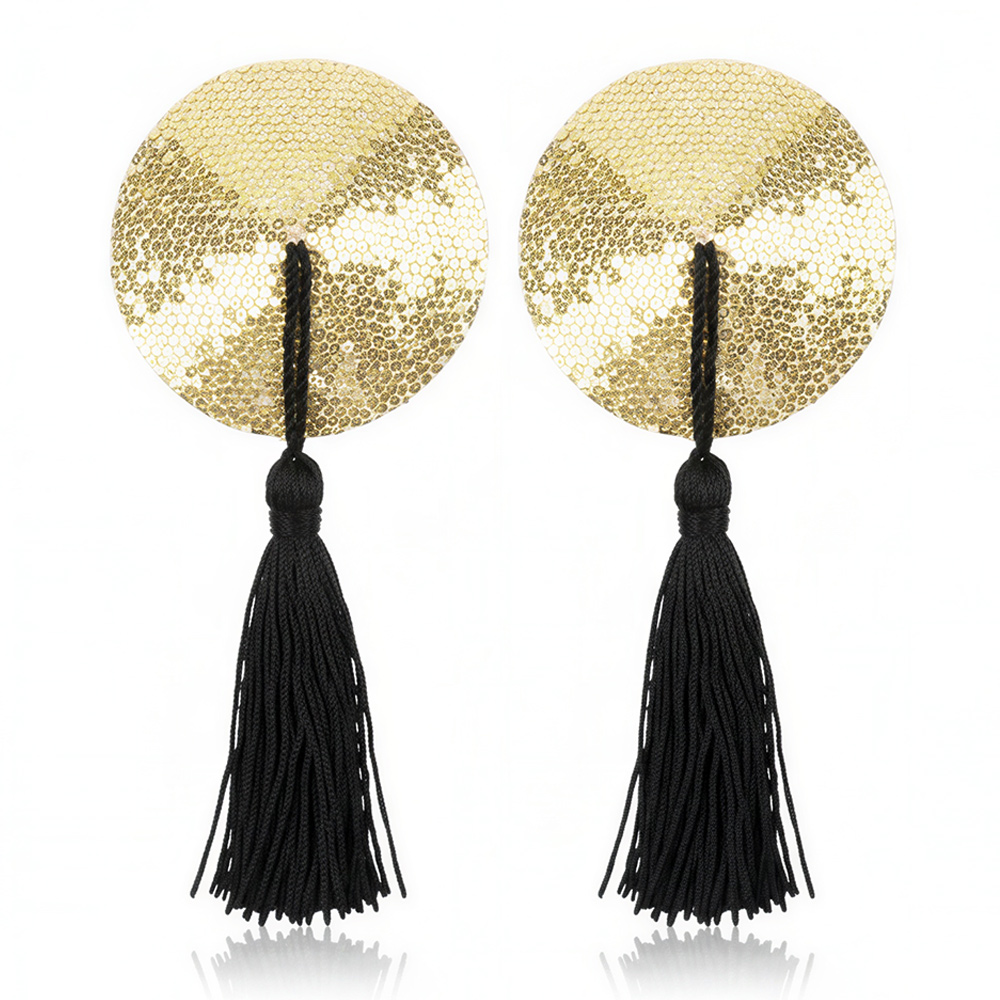 VIP BDSM Gold Sequin Nipple Pasties with Black Tassels