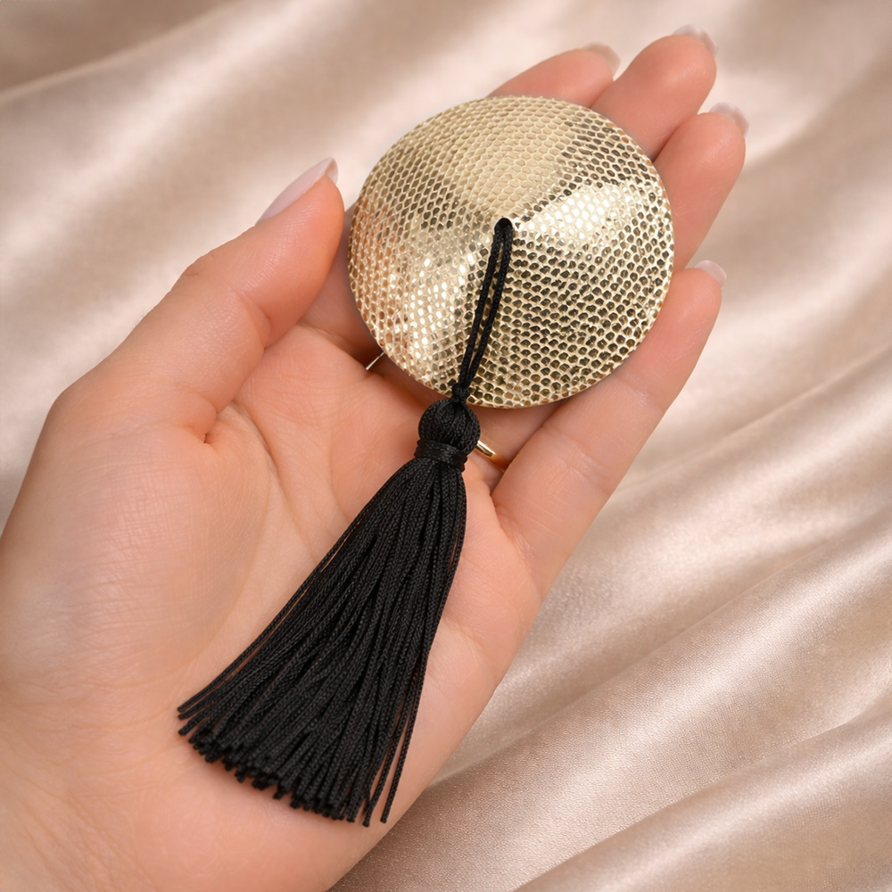 Dazzle eyes and hearts with the VIP BDSM Gold Sequin Nipple Pasties with Black Tassels! These flashy nipple accessories feature shimmery, shiny gold sequins on a circle-shaped nipple cover. These pretty boob covers have a black tassel finish and come in a set of 2 with removable adhesive backing. Perfect for burlesque style or a Halloween costume!