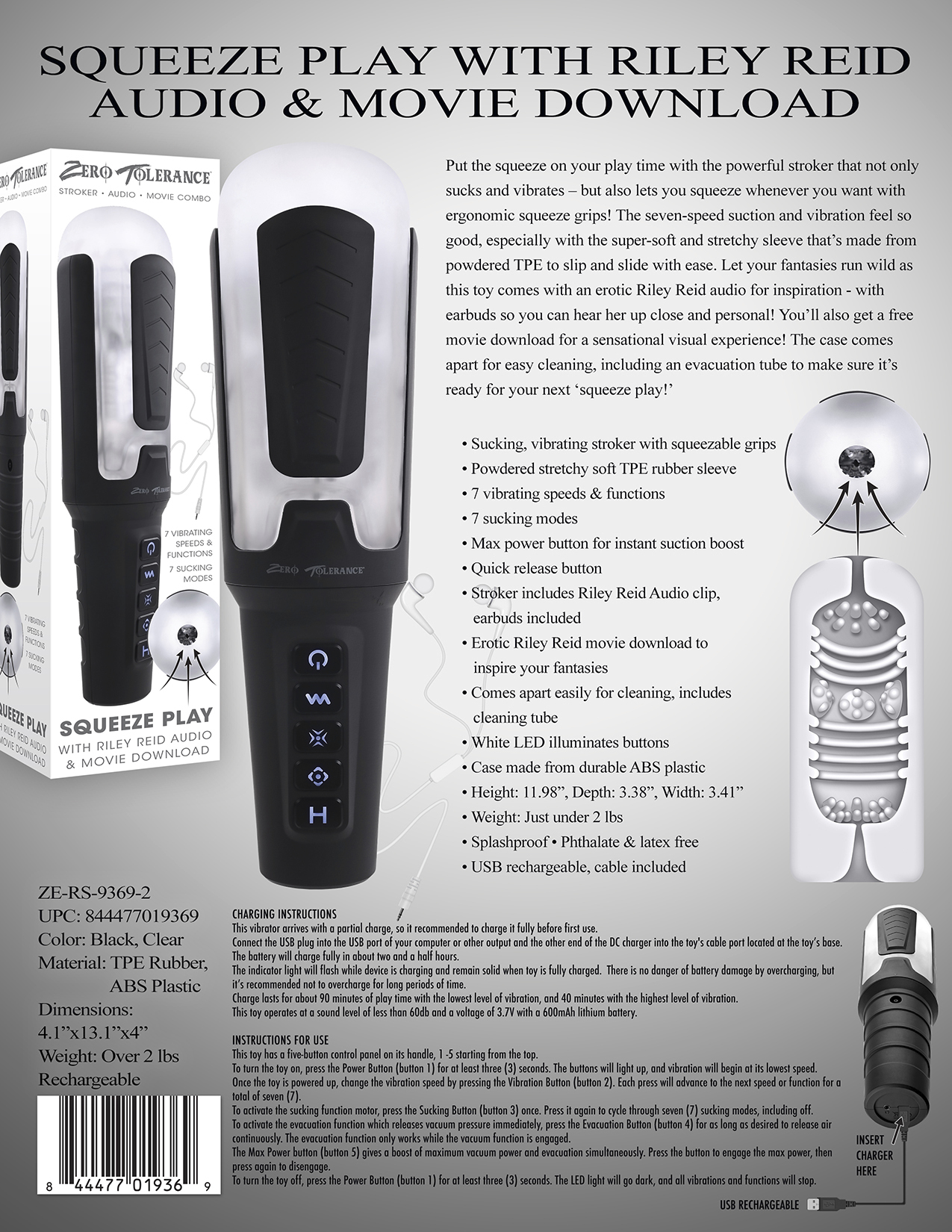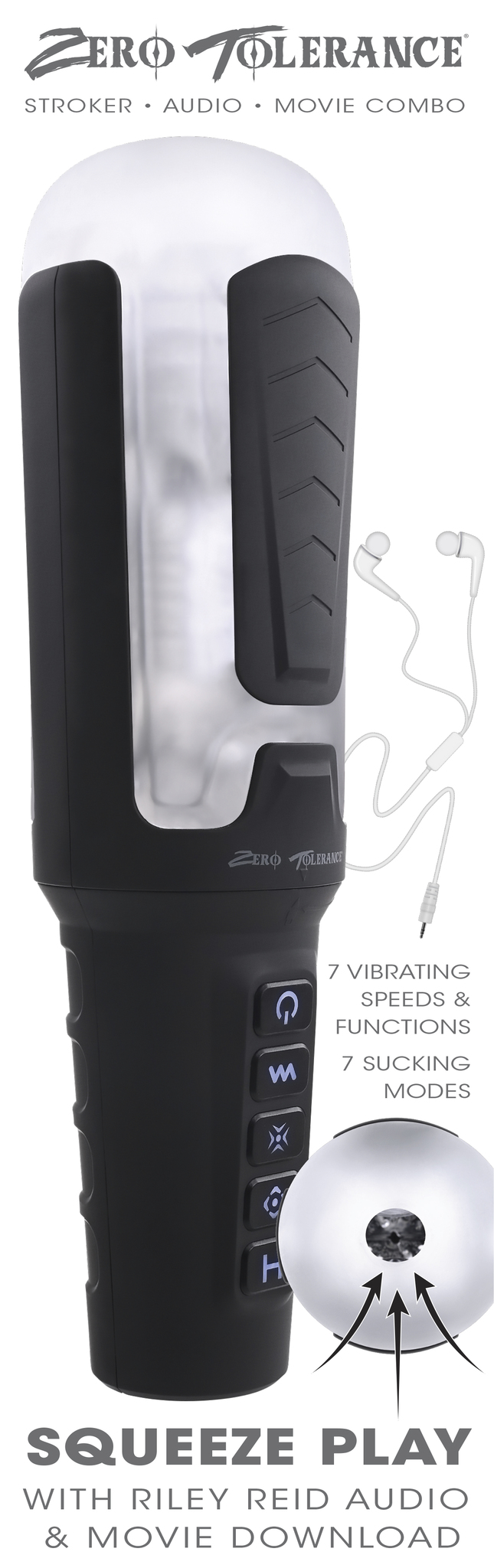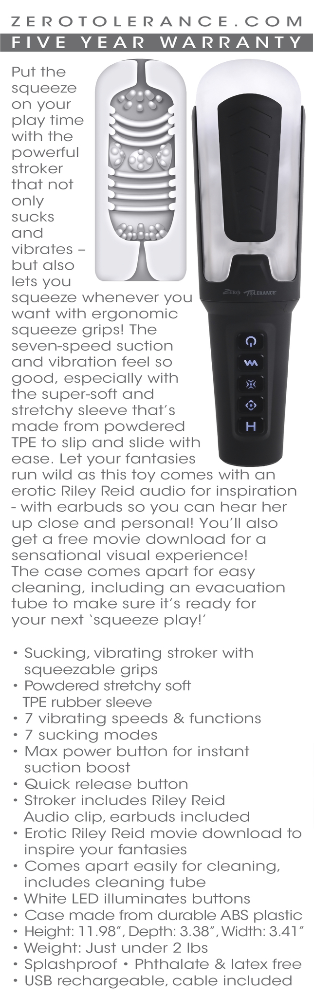 Zero Tolerance Squeeze Paly with Riley Reid from Evolved Novelties. Stroker, audio and movie combination. Put the squeeze on your play time with the powerful stroker that not only sucks and vibrates, but also lets you squeeze whenever you want with ergonomic squeeze grips! The seven speed suction and vibration feel so good, especially with the super soft and stretchy sleeve that is made from powdered Thermoplastic Elastomers TPE to slip and slide with ease. Let your fantasies run wild as this toy comes with erotic Riley Reid audio for inspiration with ear buds so you can hear her up close and personal! You will also get a free movie download for a sensational visual experience! The case comes apart for easy cleaning, including an evacuation tube to make sure it is ready for your next squeeze play! Sucking, vibrating stroker with squeezable grips. Features: powdered stretchy soft TPE sleeve. 7 vibrating speeds and functions. 7 sucking modes